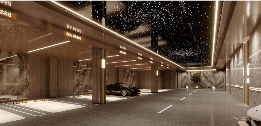 项目外立面从体银色铝板+喷鼻槟金铝板线条,区别于保守涂料立面,铝板材质历久弥新,兼顾美学取适用,让建建立面更显灵动和质量感,大大提拔了凤凰原的颜值。搭配落地天幕及全景系统窗,三玻两腔断桥铝系统落地窗。外立面线条如凤凰羽翼般舒展,夜幕下泛起的金属光泽,将来或成为高铁入城的显著地标。 地库入户通道更是“细节控的狂欢”:星空顶设想搭配定制光带,墙面采用木饰面+石材拼接,地面铜质车挡刻有项目LOGO,连消防设备都做了躲藏式处置。业从开车回家,从入库到入户,典礼感间接拉满。